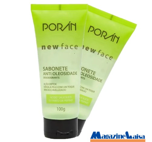 O Sabonete Antioleosidade New Face da Porán higieniza a pele enquanto proporciona um toque macio e aveludado, combatendo a oleosidade e com isso, prevenindo o aparecimento de acnes. Proporcionando perfume agradável. Possui extrato de pepino, ativo desodorante e ácido salicílico.